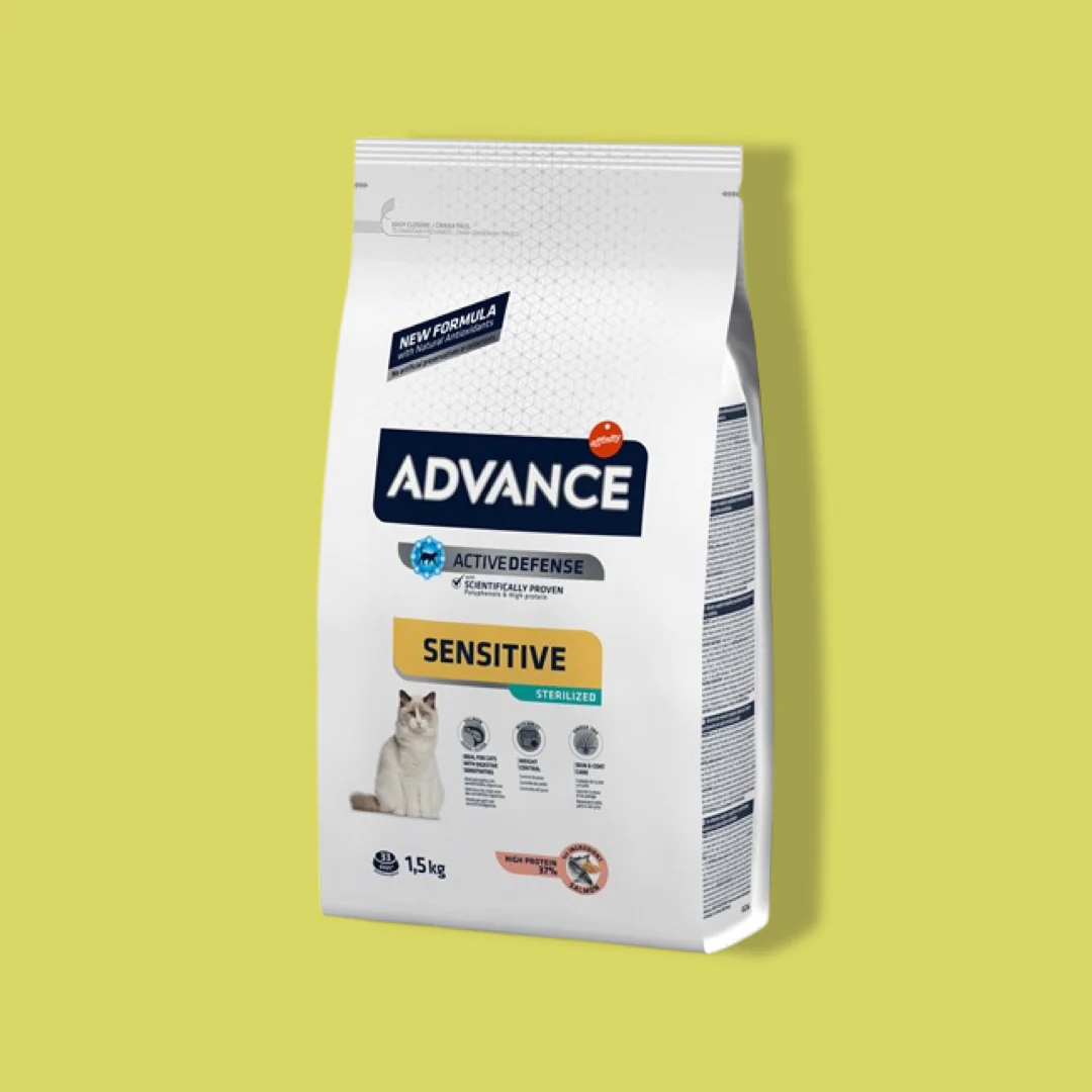 Advance Cat Sterilzed Sensitive Salmon is ideaal kattenvoer voor gesterliseerde of gecastreerde katten met voedselallergie of voedselintolerantie. Dit voer is speciaal gemaakt voor katten met deze combinatie. Het voer heeft zalm en daarmee gemakkelijk verteerbare dierlijke eiwitten als basis, voor een goede, gezonde darmwerking. Daarnaast helpt het voor overgewicht te voorkomen door de toevoeging van bijvoorbeeld L-carnite en wordt de PH van de wordt gereguleerd door mineralen en ingrediënten, om blaasproblemen te helpen voorkomen. Omega 3 en 6 zorgen voor een gezonde huid en vacht. Ideaal voer om jouw gesterilseerde kat met voedselgevoeligheid in topconditie te houden!