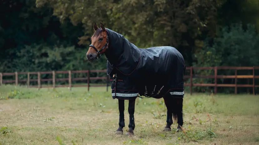 De deken is gemaakt met innovatieve materialen die zijn ontwikkeld voor duurzaamheid, ademend vermogen en de bescherming van uw paard in de weide.