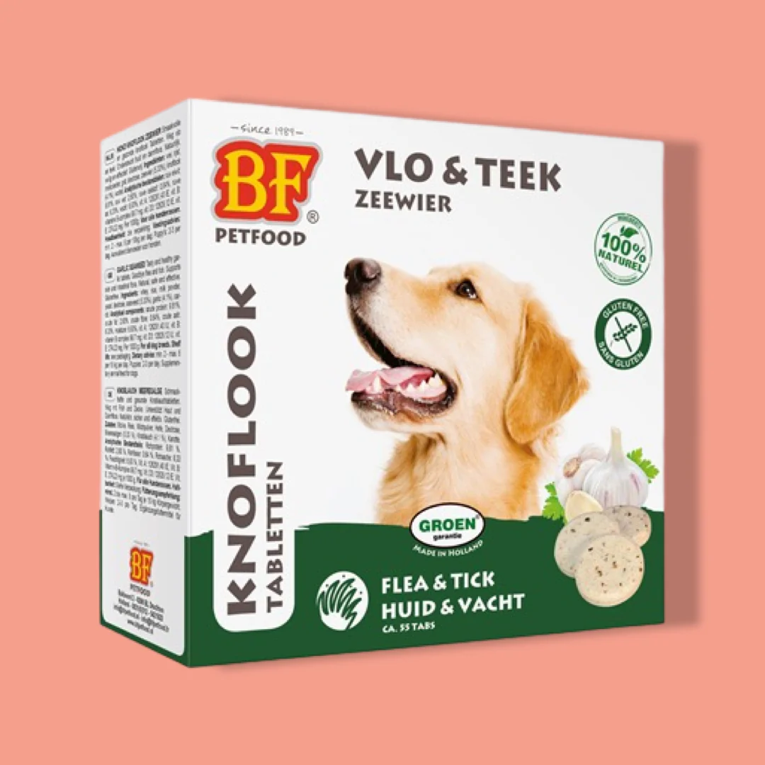 De smaakvolle gisttabletten van BF Petfood (voorheen Biofood) met zeewier, knoflook, aminozuren, vitaminen (A, B, D en E) en mineralen zorgen voor een goede afweer, huid en darmflora. Uit onderzoek is gebleken dat knoflook werkt als insectwerend middel. Onderzoeksresultaten tonen significante vermindering van tekenbeten bij het consumeren van knoflook. BF Petfood honden gisttabletten met knoflook en zeewier bevatten gezonde vitamines.