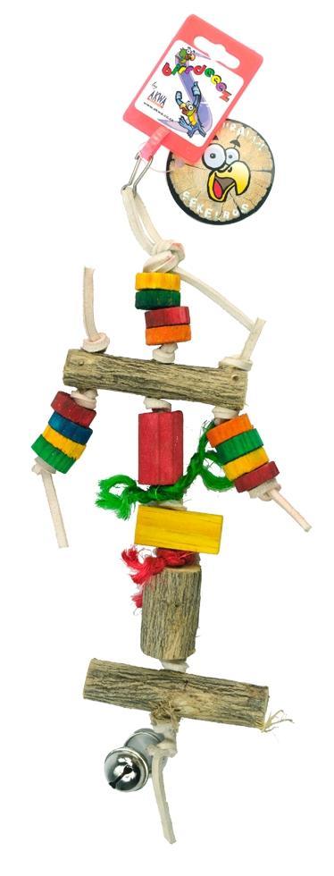 Vrolijk de kooi van uw vogel op met dit kleurrijke vogelspeeltje. Dit speeltje bestaat uit Sekelbos (hout) met vrolijk gekleurde blokjes en touw. Gemakkelijk aan de kooi te bevestigen d.m.v. het karabijnhaakje.