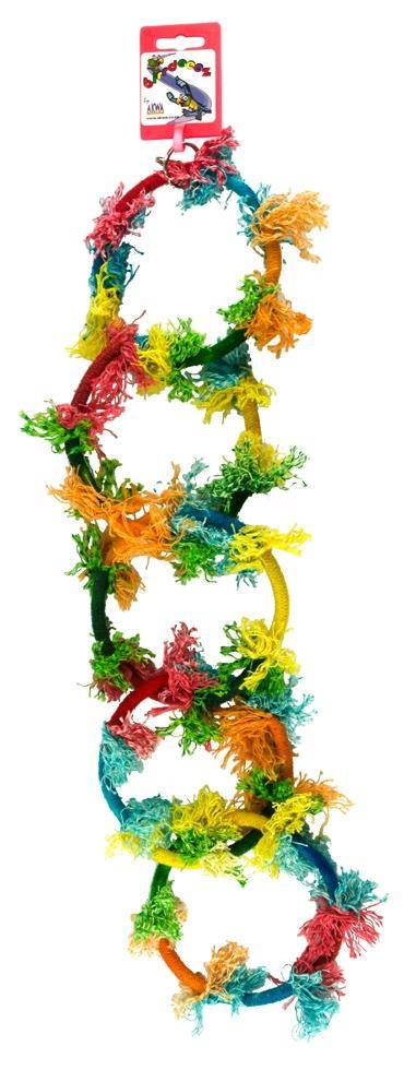 Vrolijk de kooi van uw vogel op met dit kleurrijke vogelspeeltje. Dit speeltje bestaat uit vijf ringen met zachte frutseltjes. Gemakkelijk aan de kooi te bevestigen d.m.v. het karabijnhaakje.
