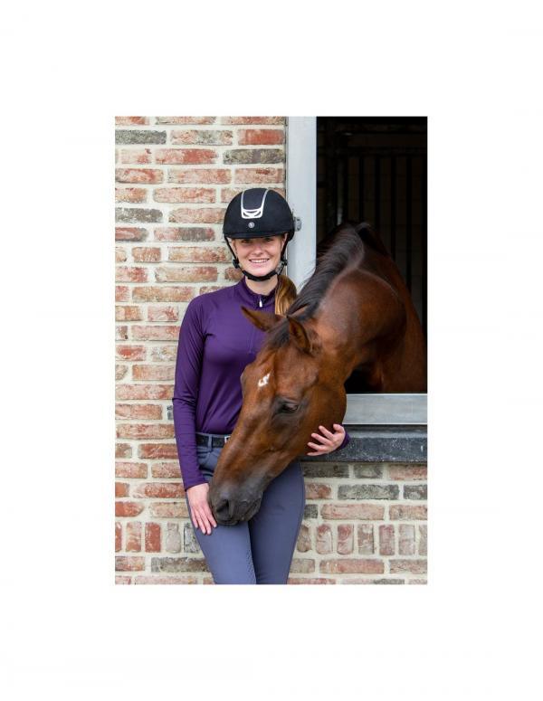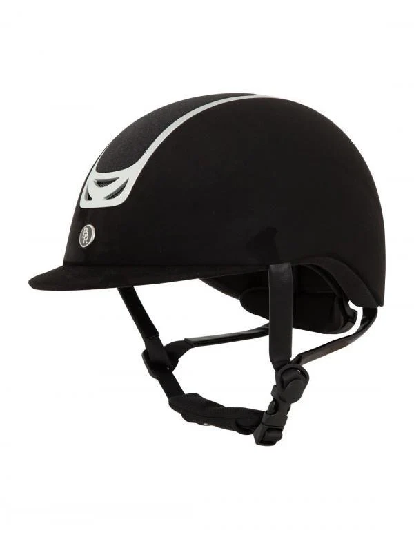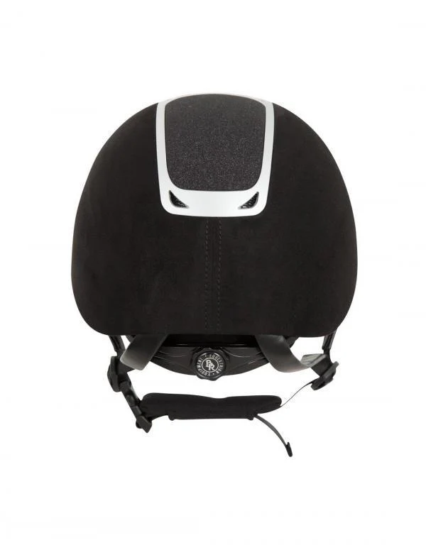 De BR rijhelm Volta microfiber heeft een lichtgewicht schaal van stevig ABS materiaal bekleed met microfiber. De top is verfraaid met glittermateriaal voor een verfijnde uitstraling en wordt omlijst en in het midden onderbroken door een stijlvolle zilverkleurige rand. Deze zilverkleurige rand is voorzien van meerdere ventilatieopeningen die samen met de binnen voering voor een goede ventilatie en vochtregulatie en zorgen.