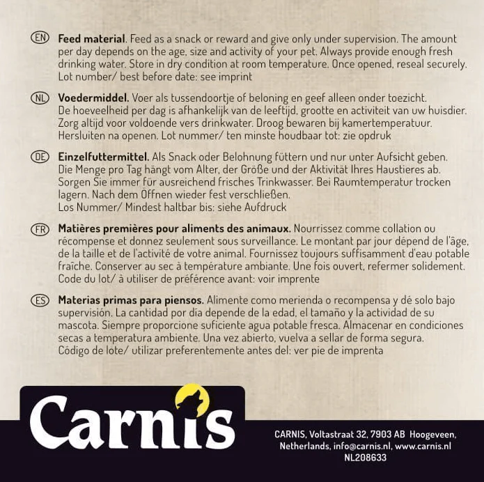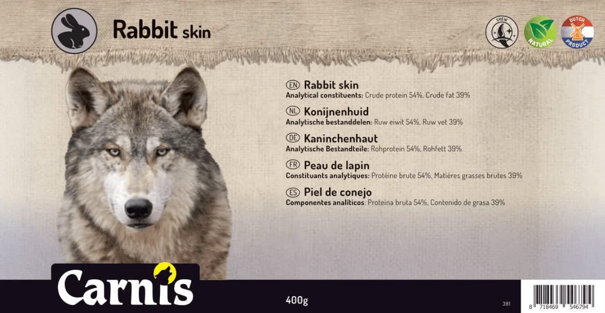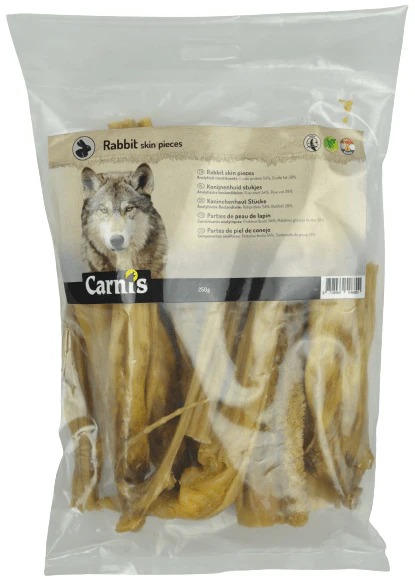 Carnis konijnenhuid is een magere kauwsnack. In de verpakking zitten meerdere dunne stukjes huid. Door het fijne formaat is de huid ook ideaal voor pups en kleine rassen.