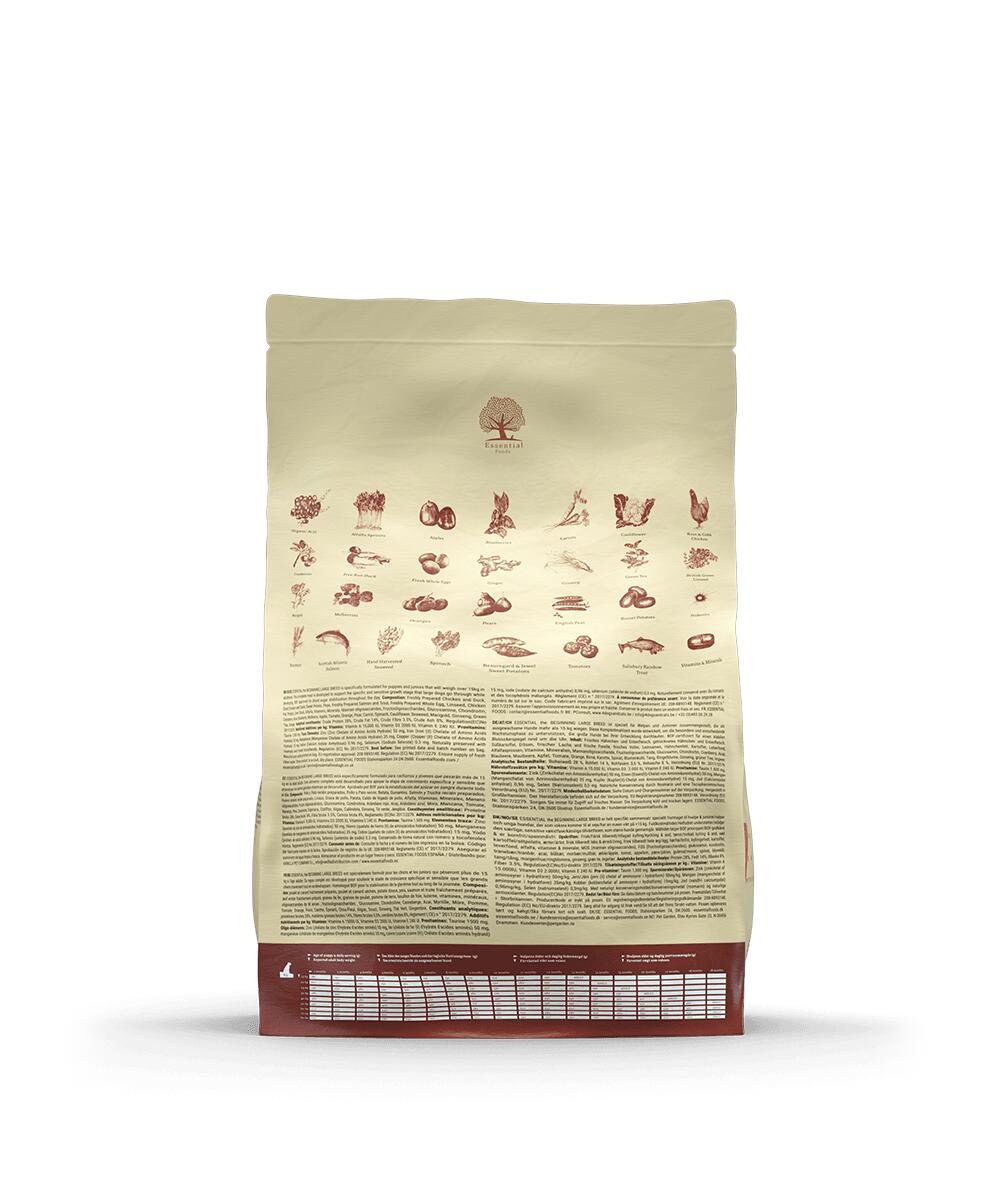 ESSENTIAL THE BEGINNING – LARGE BREED is specifiek ontwikkeld voor pups en jonge honden die als volwassen hond meer dan 15 kg gaan wegen. De samenstelling van dit voer is dusdanig dat deze specifieke, gevoelige groeifase die grotere honden doormaken er perfect door wordt ondersteund.
