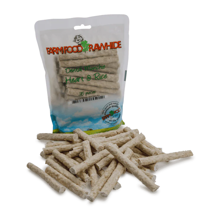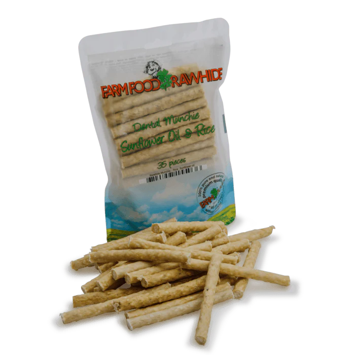 De Farm Food Rawhide Dental Munchie is een 100% natuurlijke en smakelijke kauwsnack voor honden. Vanwege de zachtere structuur is de Dental Munchie een verantwoord tussendoortje of smaakvolle beloning voor uw pup, volwassen of senior hond. De kleine stukjes onderhuids bindweefsel in combinatie met rijstbloem zorgen voor veel kauwplezier en heeft een reinigende werking van het gebit. Tijdens het kauwen op de Dental Munchie komt er natuurlijk eiwitcollageen vrij wat tandplak oplost en zorgt voor een frisse adem.