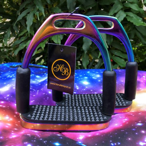 Ontdek de HB Flexibele Stijgbeugels Rainbow: luxe roestvrijstalen (RVS) veiligheidsbeugels met uniek handmatig verhit regenboog kleureffect voor een persoonlijk tintje in je ruitersport uitrusting. Deze flexibele stijgbeugels bieden schokdemping via rubberen bekleding en scharnieren, ideaal voor recreatief en wedstrijdrijden in dressuur of springen.