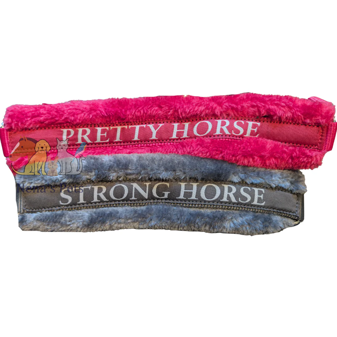 De HB halsters soft zijn verstelbaar op meerdere plaatsen op het kopstuk zitten 2 gespen om het bont in het midden van het te houden. De neusriem is verfraait met een leuke tekst.