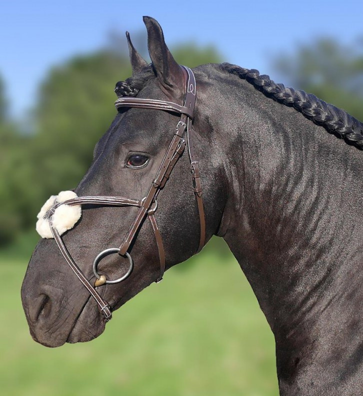 Dit mooie hoofdstel is uitgevoerd in special soft leder, met ss fournituren met blinde sluitingen aan bakstukken en teugels. Het kopstuk is zacht gevoerd en terug gesneden. Met Mexicaanse neusriem en sierstiksels op neusriem en frontriem. Dit hoofdstel is uitgevoerd met extra vacht op de neusriem.