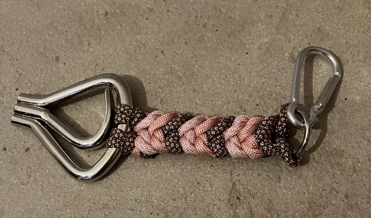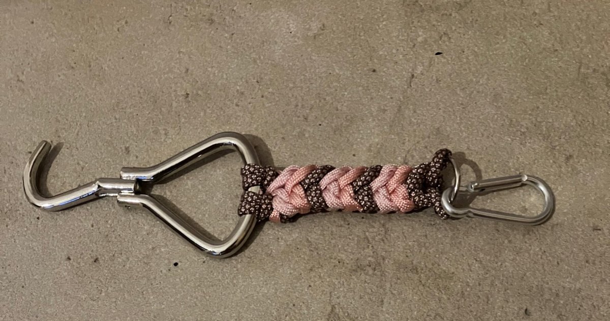 Aan de hoevenkrabber zit een handige karabijnhaak zodat je hem makkelijk aan je tas kan hangen.