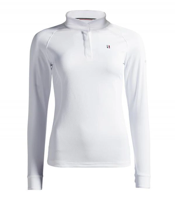 Dit klassieke wedstrijdshirt biedt het ultieme in elegante prestatiekleding voor de enthousiaste ruiter. Ontworpen om de prestaties te verbeteren door flexibiliteit en bewegingsvrijheid en tegelijkertijd een klassiek en chic silhouet te garanderen. Elke steek en naad is zorgvuldig overwogen en afgestemd op de paardensport. Dit overhemd heeft een verfijnde geweven sluiting en kraag, gecombineerd met verborgen drukknopen voor gebruiksgemak. De lange mouwen en het hoofdgedeelte van dit shirt zijn gemaakt van kreukvrije jersey, terwijl de zijpanelen zijn gemaakt van een technische micropique-stof die niet alleen ademend, maar ook sneldrogend en vochtafvoerend is! Gemaakt van 95% polyester en 5% elastaan.