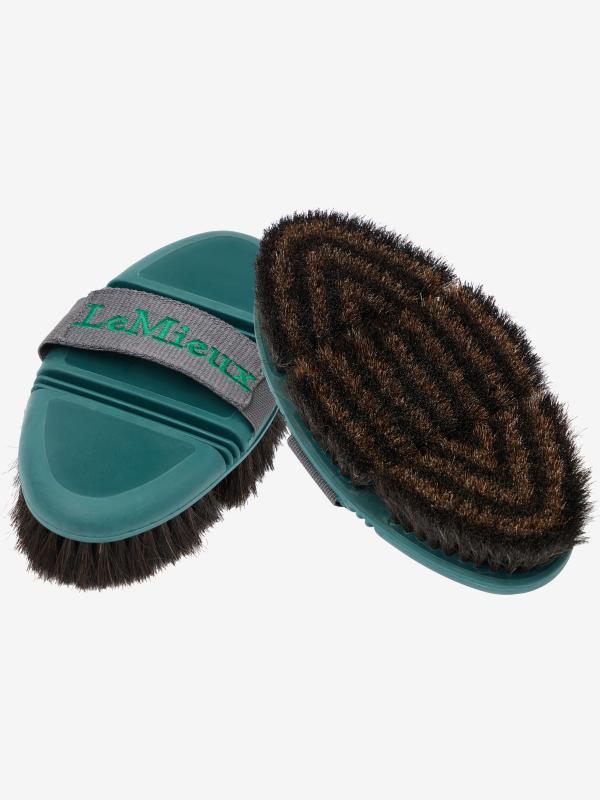 De natuurlijke paardenharen op de LeMieux Flexi Horse Hair Body Brush hebben de voorkeur van professionele grooms vanwege het vermogen om hardnekkig vuil te verwijderen en de vacht een verbeterde glans te geven, terwijl het flexibele ontwerp bijna elk deel van het lichaam van het paard bereikt. De ergonomische vorm past perfect in de hand waardoor polsbelasting en grijpkracht op de borstel worden verminderd, terwijl een verstelbare band zorgt voor de perfecte pasvorm
