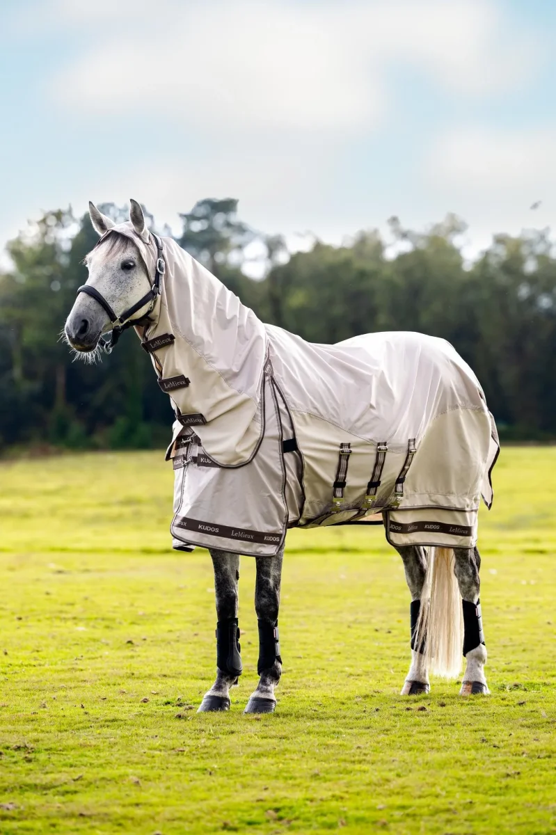 Ontworpen met bescherming tegen jeuk in het achterhoofd, heeft de deken extra bescherming bij de nek, de schoft en de bovenkant van de staart, een waterdichte bovenlijn en een ademende ’two-part skirt’ met volledige dekking onder de buik.