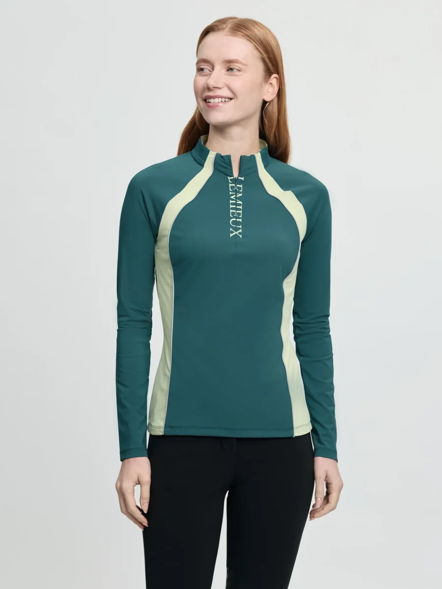 De contrasterende panelen geven de look een boost en flatteren je figuur, terwijl het opvallende verticale LeMieux-logo in een contrasterende kleur over de kwartrits valt.
