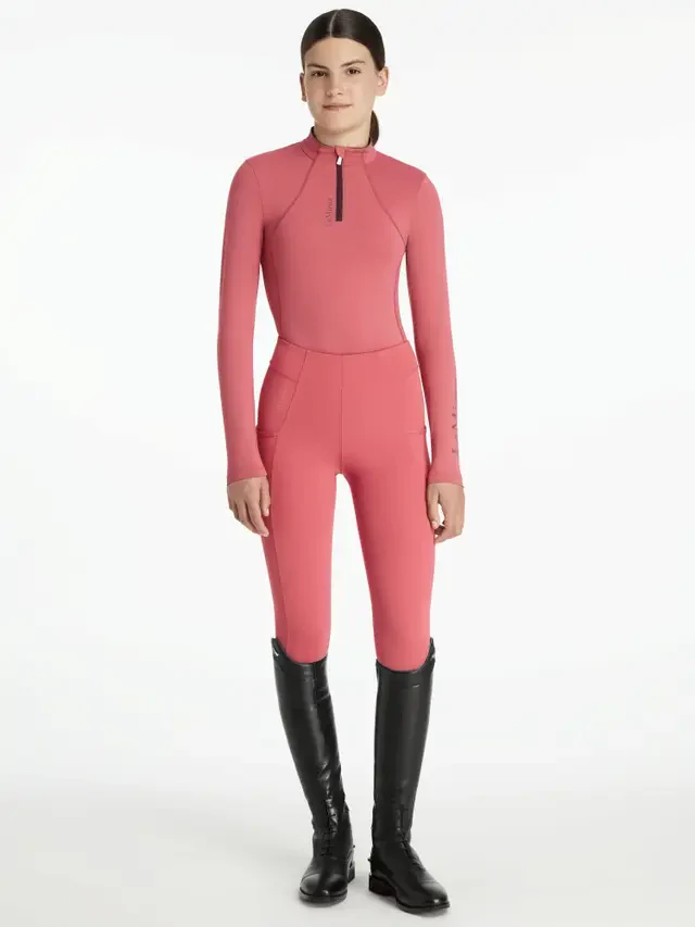 Deze technische baselayer met kwartsrits is ontworpen om de lichaamstemperatuur te reguleren en biedt daarbij UV50+ bescherming tegen zonnestralen. Perfect voor actieve jonge ruiters! Ventilatie onder de armen houdt je koel en droog, en de unieke technische stof voert vocht af van de huid voor optimaal comfort.
