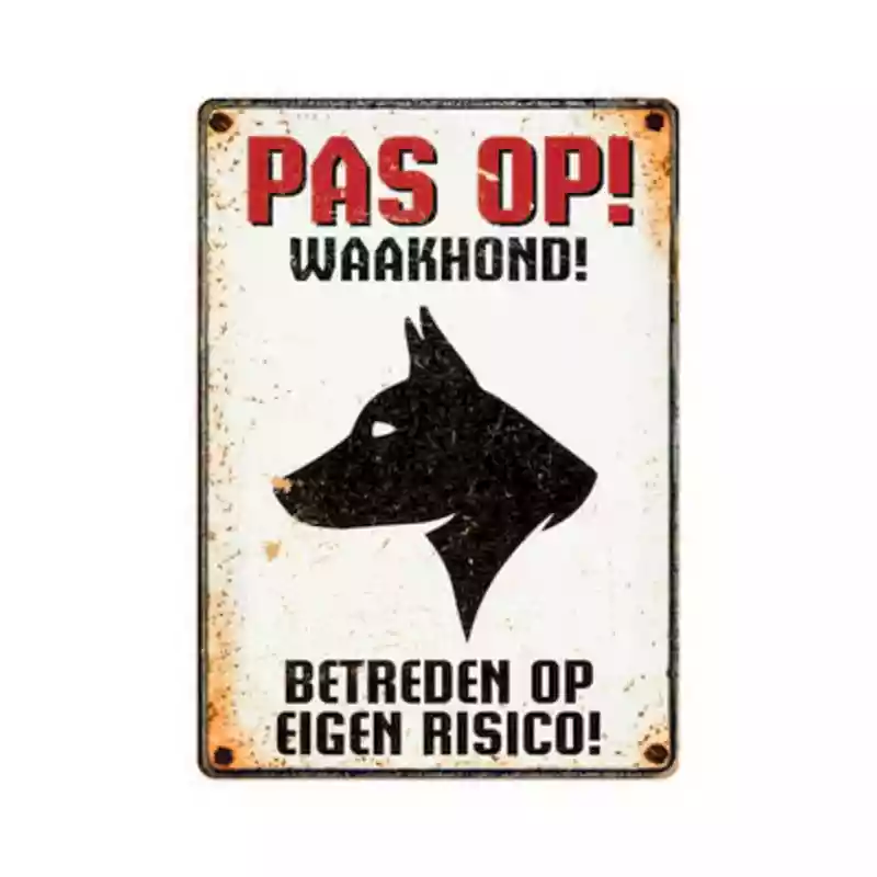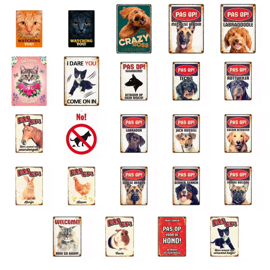 Deze stevige metalen bordjes combineren humor, stijl en functionaliteit in één. Elk bordje heeft een opvallende, kleurrijke afbeelding van een dier (zoals hond, kat of ander huisdier) met een grappige of lieve waaktekst. Ideaal voor aan de voordeur, poort, schutting of kennel.