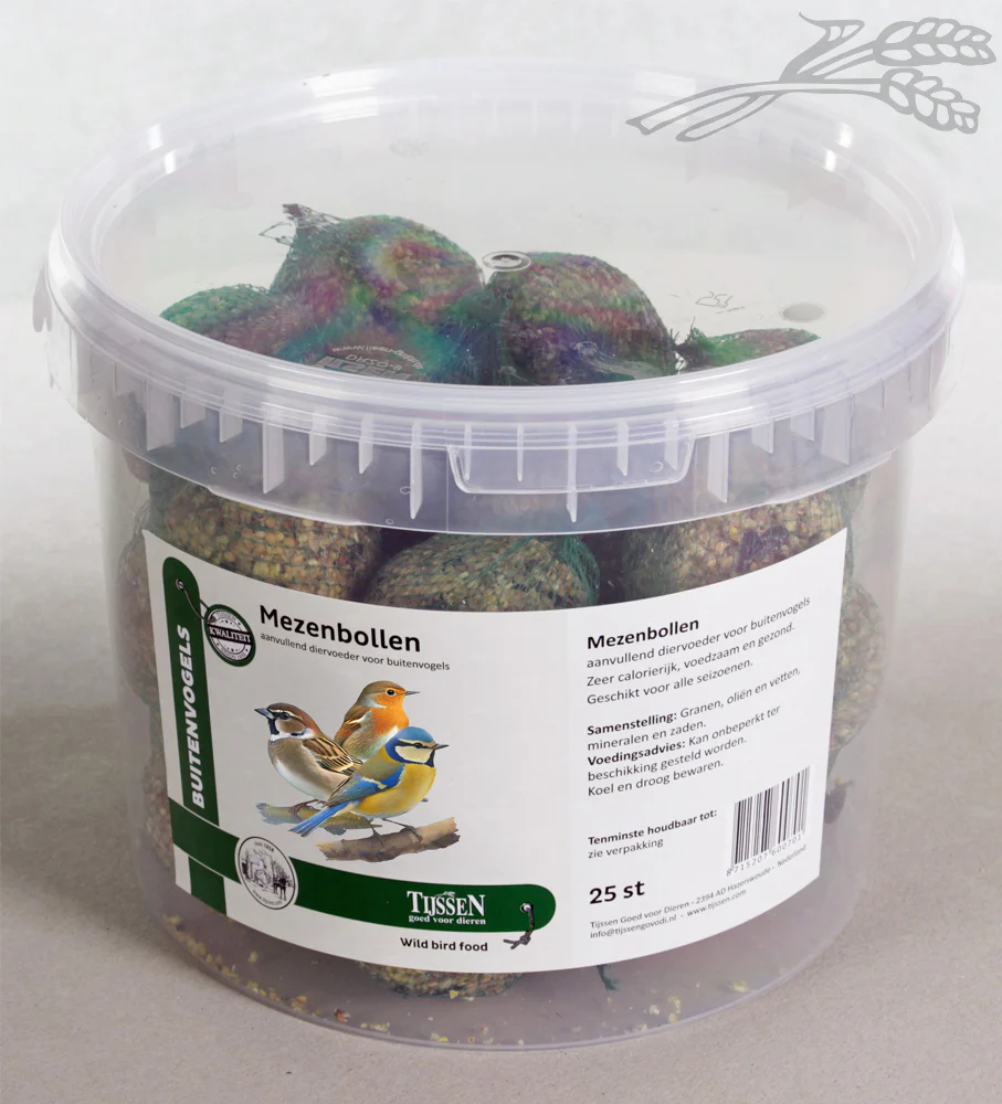 Met deze emmer vol mezenbollen kunnen de buitenvogels wel even voorzien worden in hun extra energiebehoefte.