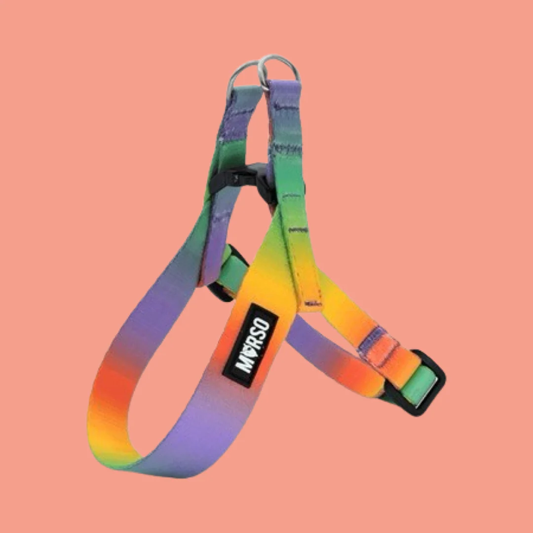 Stel u voor: uw hondje dartelend in het park, stralend in dit kleurrijke, bijna poëtische tuigje. De regenboogkleuren vangen de blik, terwijl het ‘ombre’-patroon een vleugje elegantie toevoegt aan elke wandeling. Het is niet zomaar een tuigje; het is een statement van vreugde en zorg. En toch, het is zo praktisch, zo alledaags, dat het naadloos past in elk avontuur. Wat wilt u nog meer?