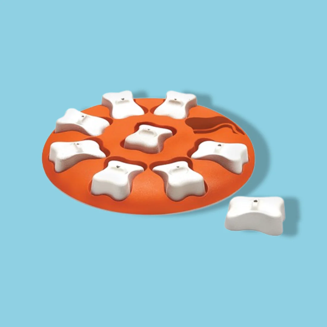 Hoe werkt het? Nou, je plaatst de lekkernijen in de compartimenten van de basis. Bedek de compartimenten met de botten (puzzelstukjes). Hoe meer compartimenten er zijn, hoe moeilijker het spel zal zijn. Toon je hond waar de traktaties zijn en kijk hoe hij de smakelijke beloning vindt. Lukt het nou niet? Laat dan sommige compartimenten open voor de hond om zijn interesse te wekken.