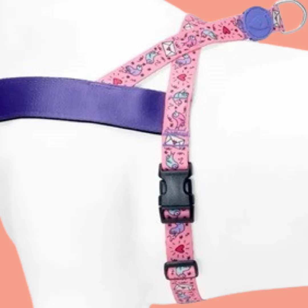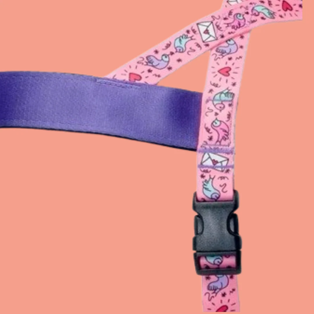 Het design? Een absolute droom! Dit roze hondentuig pronkt met de speelse ‘Sweet Tweet’ print, een vrolijk motief van vogeltjes en hartjes dat je iedere keer weer doet glimlachen. De zachte roze tint wordt prachtig gecomplementeerd door de lila band en de opvallende paarse accenten. En let op dat detail: de uil-vormige sluiting in paars, een subtiele knipoog die het geheel net dat beetje extra charme geeft. Een ware eyecatcher, vind je niet?