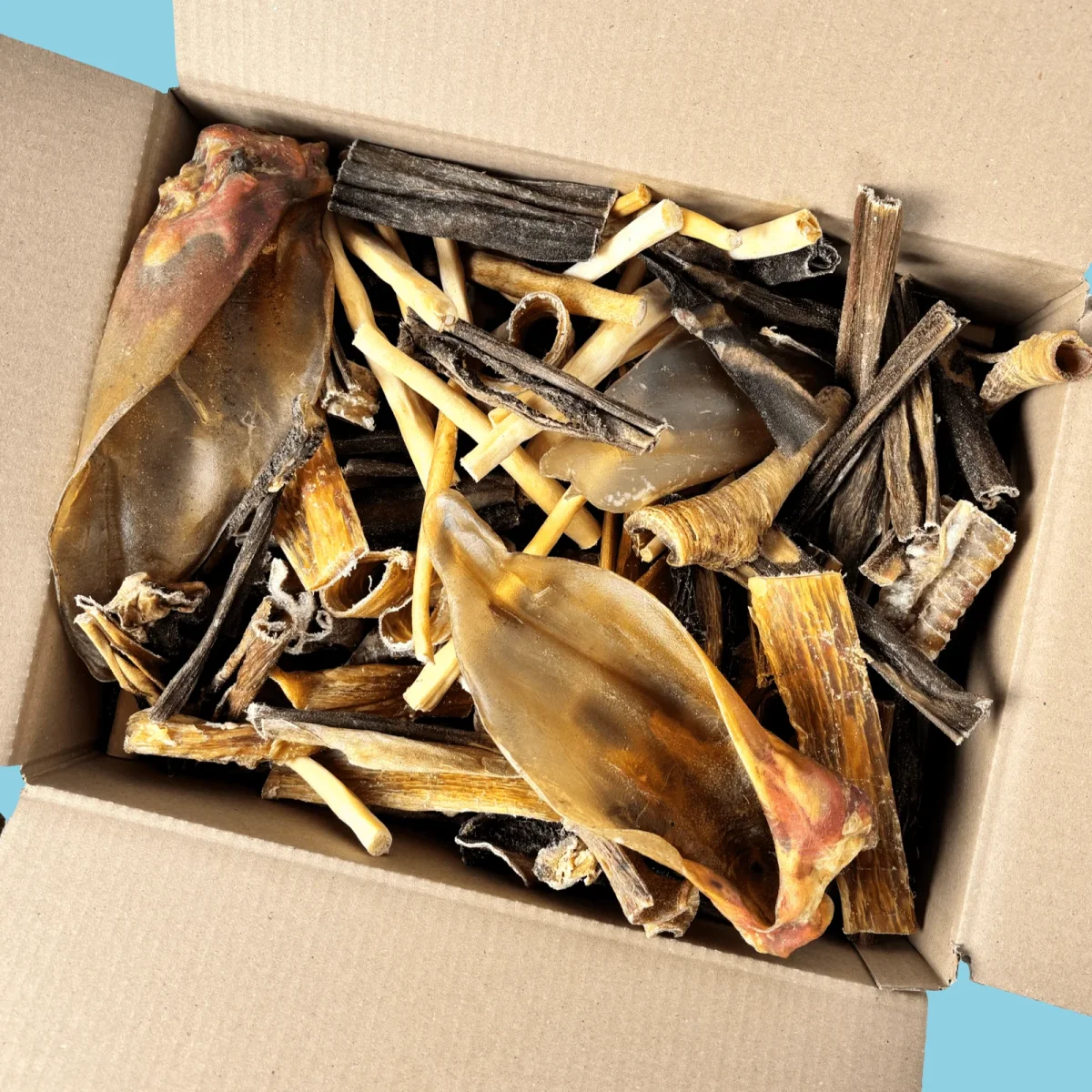 Inhoud kan verschillen en bevat onder andere: rundernekspier, pensstaafjes, bullepees, zalmhuid, runderoren, buffelstaart en meer!