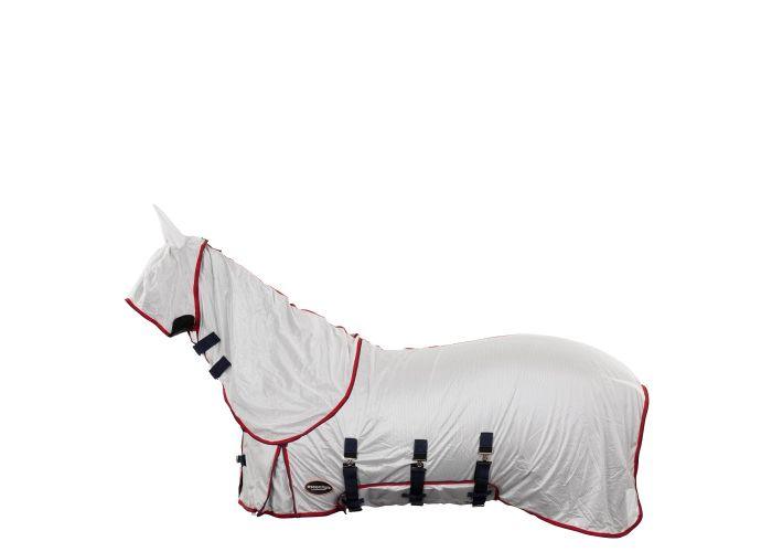 Deze deken is voorzien van een hals, een buikflap en een hoofdkap.