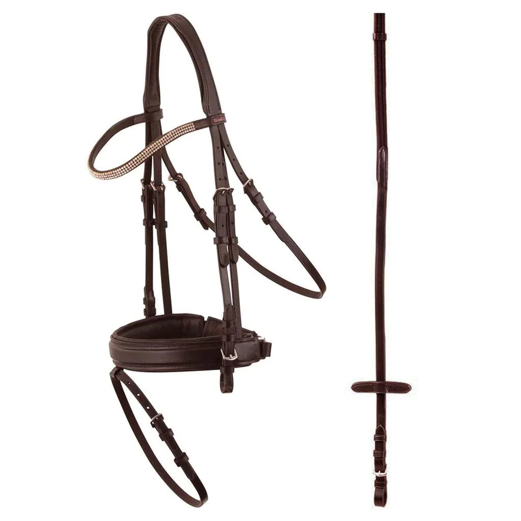 Symmetrisch hoofdstel met een anatomisch gevormd, zacht gevoerd kopstuk dat terug gesneden is bij de oren voor extra vrijheid. Het licht gebogen frondeel heeft een goudkleurige ketting met drie rijen imitatie diamanten en is onderlegd met zacht leder.