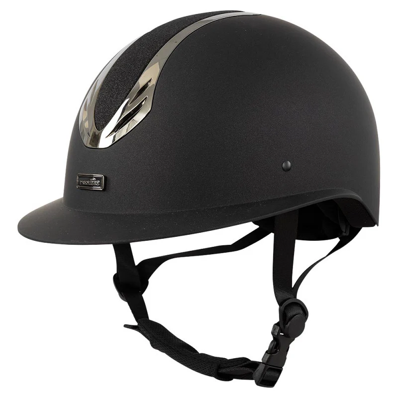 Deze mooie rijhelm valt op door het matte design in combinatie met het shiny gunmetal frame en de glittertop. Dankzij de draaischijf kan de pasvorm versteld worden totdat de helm perfect zit. Daarnaast zorgt de uitneembare, sneldrogende voering van Cooldry materiaal voor een optimale vochtregulatie zodat je hoofd droog blijft.