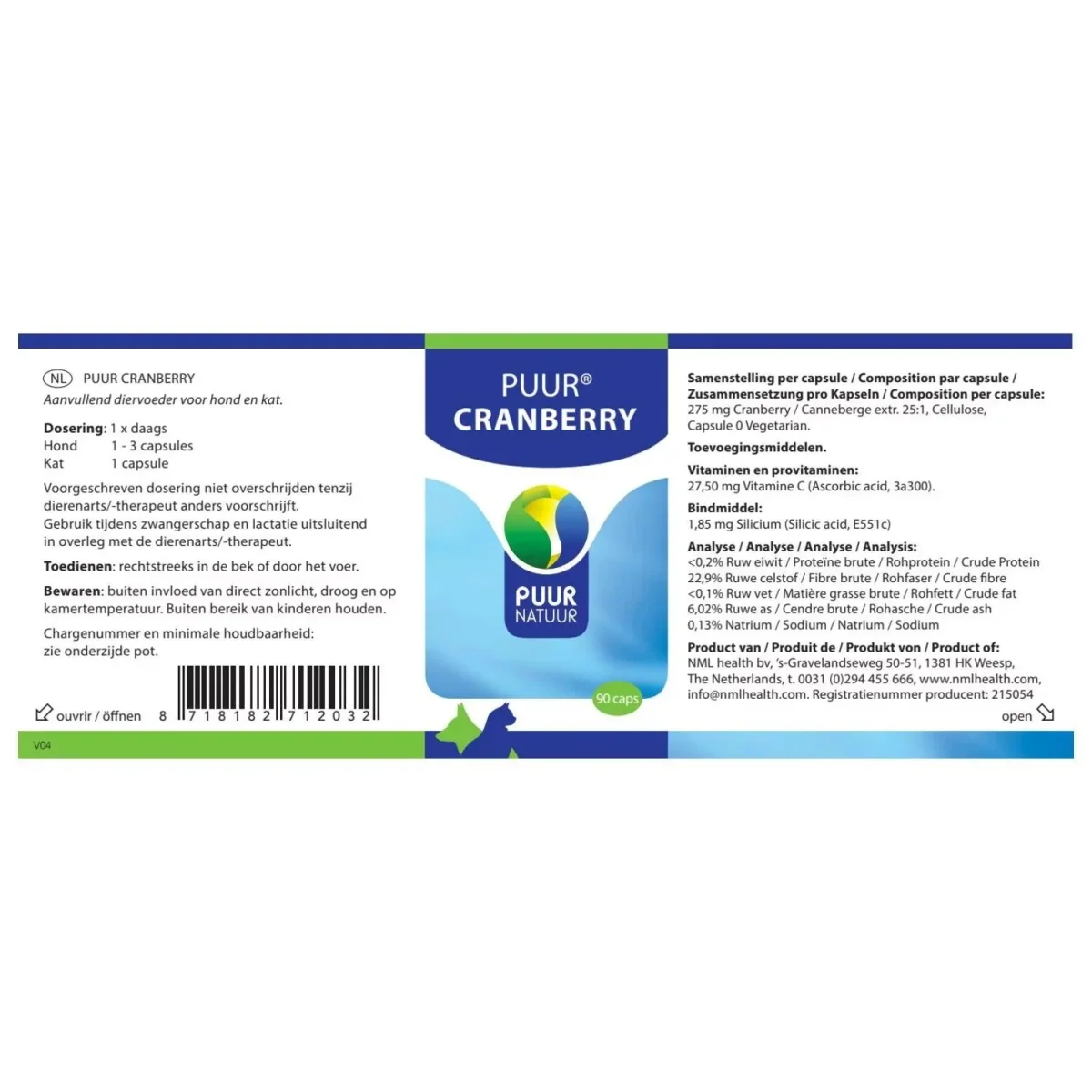 PUUR Cranberry Capsules kunnen helpen bij de ondersteunen de gezondheid van de urinewegen bij honden en katten. Dit natuurlijke supplement bevat krachtig cranberry-extract en vitamine C, wat bijdraagt aan een gezonde urinewegfunctie en het welzijn van het dier.