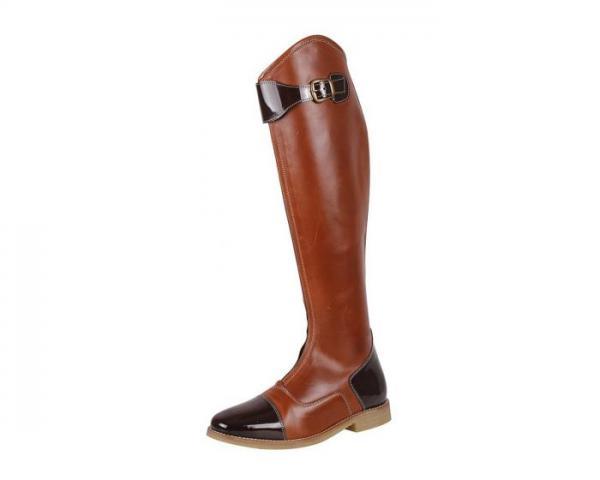 QHP Rijlaars met een sportieve polo look door de gespsluiting gemaakt van rundleer met wit stiksel. Met hak, neus en gespsluiting van lakleer. Door de rits aan de voorzijde is de laars makkelijk aan te trekken.