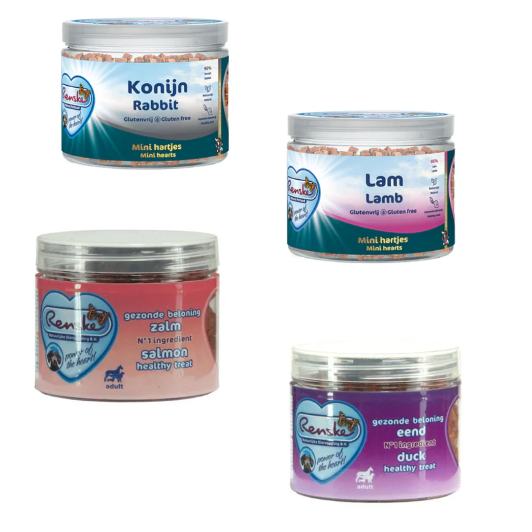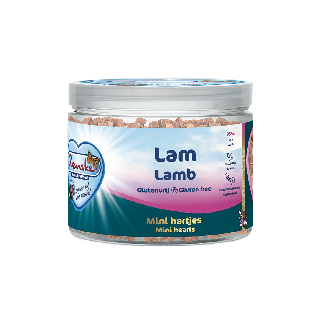 Ideaal als verantwoord tussendoortje of trainingssnoepje! Een beloning in hartjesvorm met als hoofdingrediënt lam, 95%. De beloningen zijn geschikt voor honden van alle rassen, vanaf 9 weken. Ideaal in combinatie met het variatiemenu van Renske. Ook in deze beloning is maar één eiwitbron gebruikt. Zo kunnen ook honden met een allergie of intolerantie voor een bepaalde eiwitbron van de beloningen genieten.
