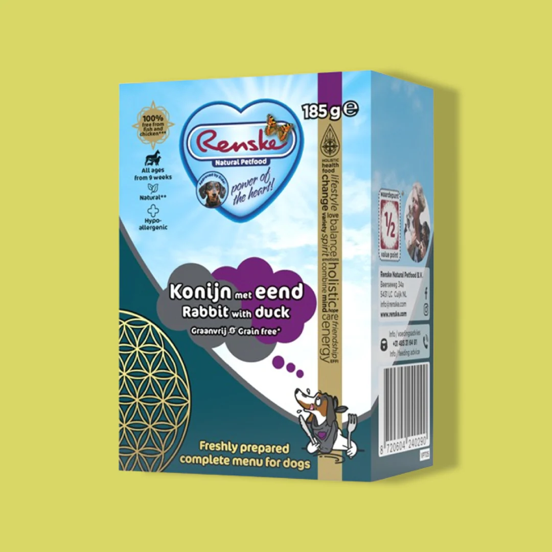 De Renske Vers Bereide Maaltijd Met Konijn En Eend Graanvrij natvoer van is een volledige, smakelijke vers bereide vleesmaaltijd voor honden vanaf 9 weken, met 60% vers bereid vlees, rijst en groenten. Jouw hond geniet van dit natuurlijke, vers bereide natvoer van Renske!