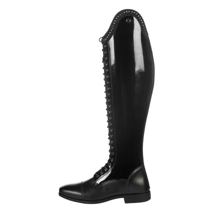 De rijlaarzen Amalfi van Lauria Garrelli combineren exclusief design met de hoogste kwaliteit en functionaliteit. Gemaakt van hoogwaardig leer met elegante lakleren details, zien ze er niet alleen elegant uit, maar bieden ze ook maximaal comfort. De voering van echt leer zorgt voor een aangenaam draagcomfort, terwijl de binnenzool van memory foam perfecte ondersteuning en demping garandeert. De slanke voetvorm en de geraffineerde vetersluiting geven de laars een stijlvol silhouet. Dankzij de hoogwaardige rits aan de zijkant is een gemakkelijke instap gegarandeerd. De licht verstevigde buitenkant ondersteunt een stabiele beenligging, terwijl de hoge dressuurstrik met fonkelende strass-steentjes een verfijnde touch toevoegt – een must-have voor veeleisende ruiters met stijl.