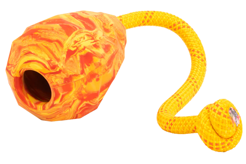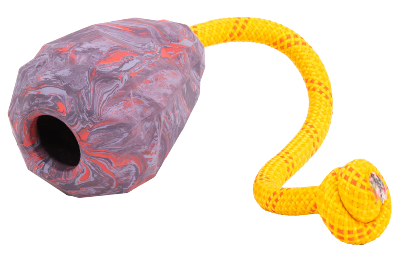 De kegelvorm is gemaakt van natuurlijk latexrubber, sterk genoeg voor intensieve speelsessies en bestand tegen stevige kaken. Het handvat van het touw kan na verloop van tijd slijten, maar dankzij het slimme ontwerp kun je het touw eenvoudig vervangen door je eigen koord – zo gaat het speeltje langer mee.
