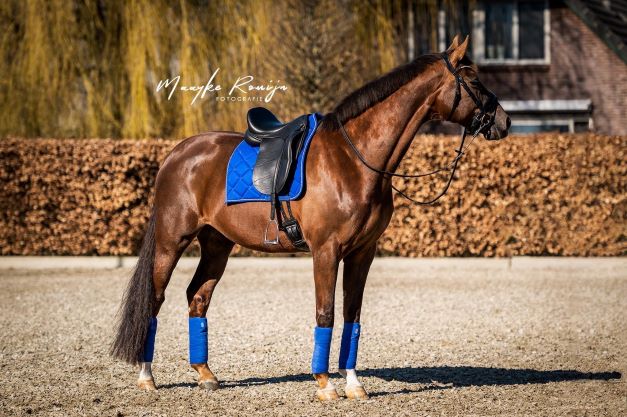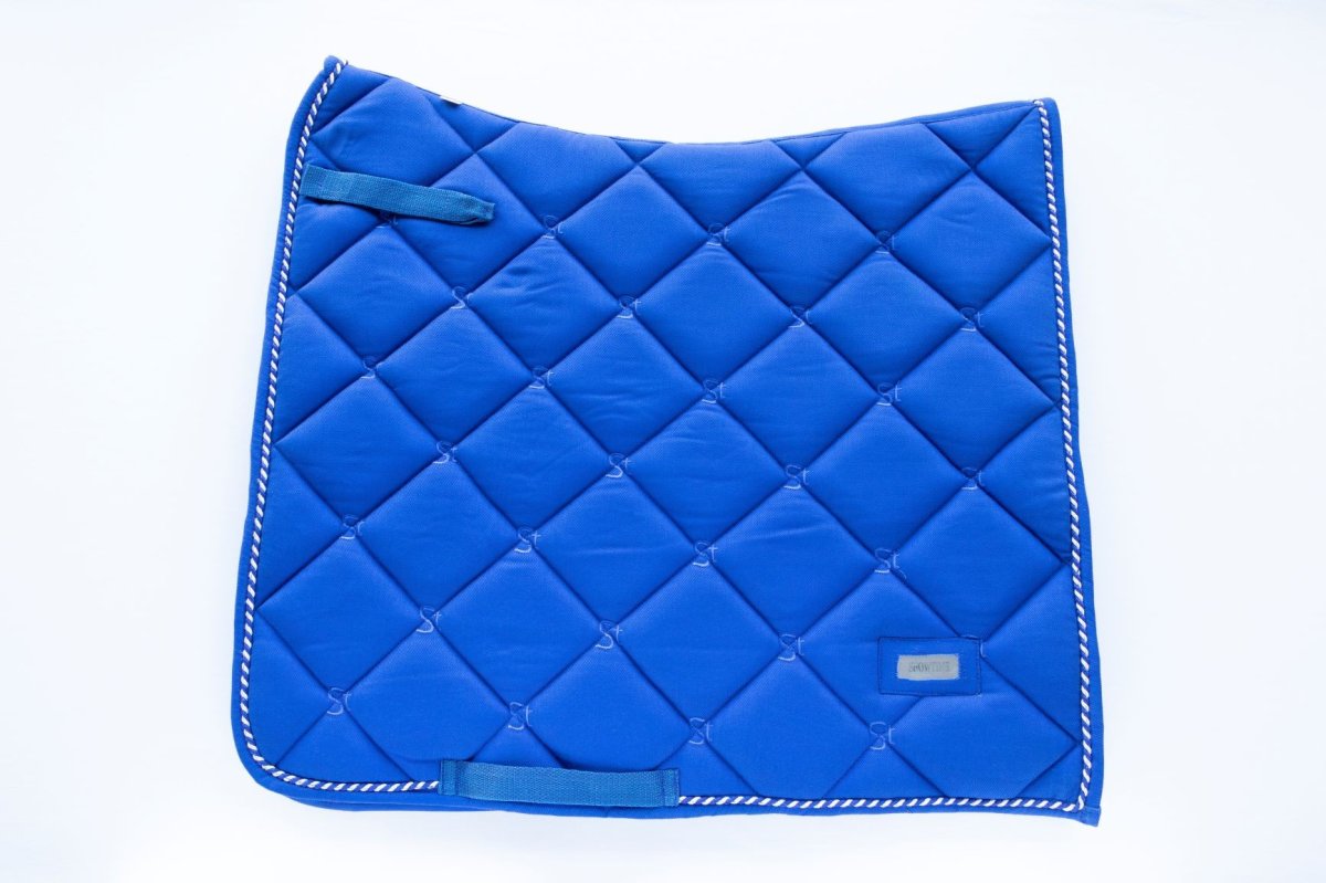 Anatomisch en stijlvol zadeldek in diep Royal Blue met duurzame katoenen buitenstof en subtiel gestikt Showtime-logo. Het tweekleurige fantasiekoord versterkt de luxe uitstraling, terwijl de ademende Cool Max voering optimale vochtregulatie en comfort biedt tijdens elke dressuurtraining en wedstrijd.