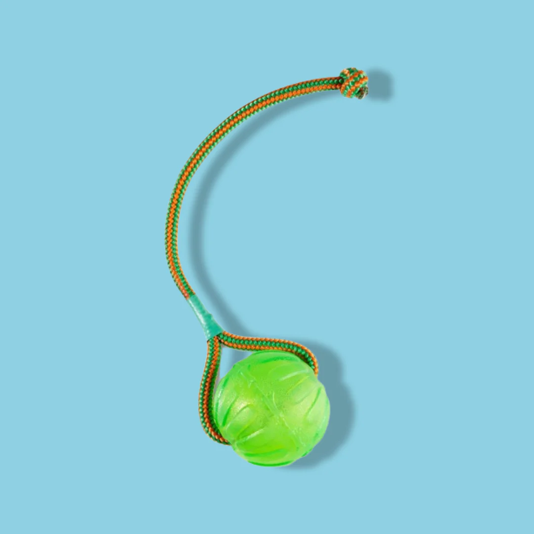 Deze unieke groene bal, vervaardigd uit een materiaal dat tegen een stootje kan – zelfs de meest enthousiaste kaken – zit stevig vast aan een robuust koord. Dat koord maakt het niet zomaar een kauwbal; het transformeert elke speelsessie tot een dynamisch avontuur. Weet u, het is de perfecte combinatie van een duurzame kauwervaring en de mogelijkheid tot intensief, interactief spel.