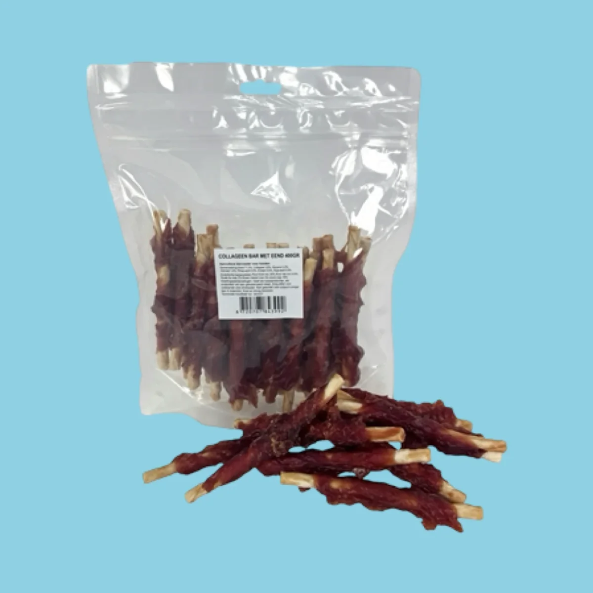 De Collageen Stick Eend is een stevig tussendoortje met 71% eend en 22% collageen. Een smakelijke snack voor honden die van kauwen houden. Ideaal als traktatie naast de dagelijkse voeding. Niet geschikt voor puppy’s jonger dan 4 maanden.