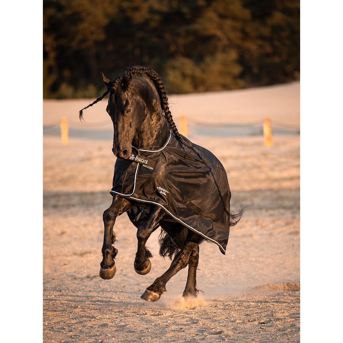 De Bucas Therapy Cooler is een multifunctionele deken die gebruikt kan worden als staldeken, onderdeken en transportdeken. De bovenlijn van de deken is gemaakt van een therapeutische stof. De magnetische velden die het paard van nature maakt worden opgevangen door de stof en terug gereflecteerd. Hierdoor wordt de bloedcirculatie gestimuleerd. Dit zorgt voor ontspannen spieren en helpt bij een sneller herstel van zwellingen en blessures.