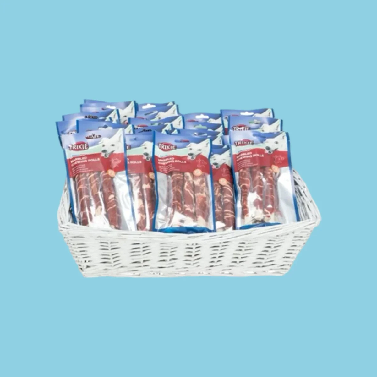 De Trixie Denta Fun Marbled Beef Chewing Rolls 17 cm van 140 gr zijn aanvullend diervoer voor de hond. Het is een smakelijke, glutenvrije hondensnack van runderhuid met rundvlees en vis. Lekker, goed tegen verveling en ook nog eens goed voor het gebit! Deze rol bestaat uit gedroogde runderhuid met daaromheen een mengsel van rundvlees en vis, wat het vlees zijn gemarmerde uiterlijk geeft. Deze lekkere snack voorkomt verveling omdat jouw hond er actief mee bezig in en helpt het tandvlees te verzorgen: wrijving van runderhuid langs de tanden verwijdert bacteriën en vuil en helpt zo tandplak te voorkomen. Deze snack is glutenvrij.
