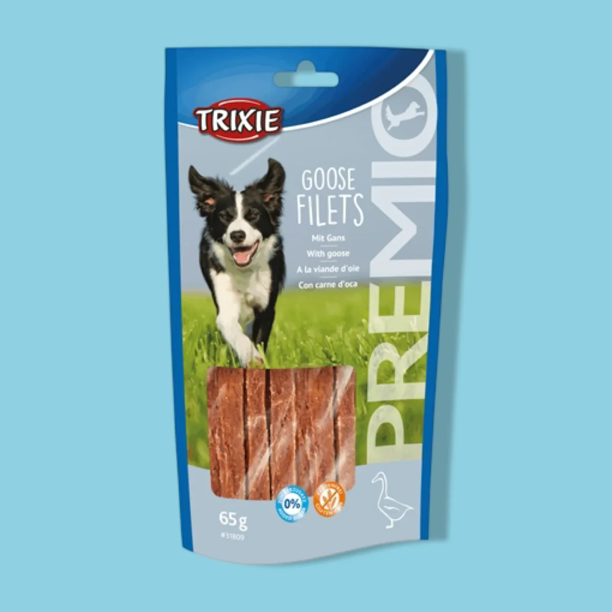De Trixie Premio Goose Filets van 65 gr per 12 st hondensnacks zijn lekkere filetstrips met gans, met een vleesgehalte van 70% vlees en zonder gluten en toegevoegde suikers. Een heerlijke beloning of snack voor tussendoor voor jouw hond! Deze malse reepjes met gans bestaan voor maar liefst 70% uit vlees en zijn rijk aan proteïnen. De lekkere snack is vrij van gluten en toegevoegde suikers en dus een gezonde beloning.