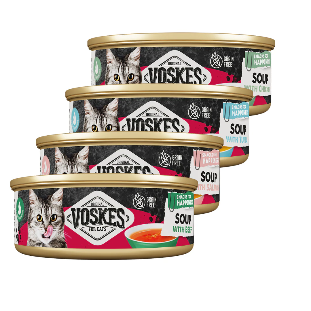 Deze soepjes zijn de ideale traktatie die je kat stimuleert om meer te drinken. Deze bouillons zijn beschikbaar in 4 heerlijke smaken en bevatten fijne stukjes vis en/of vlees.